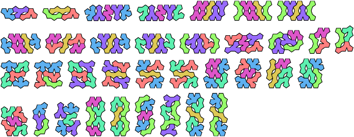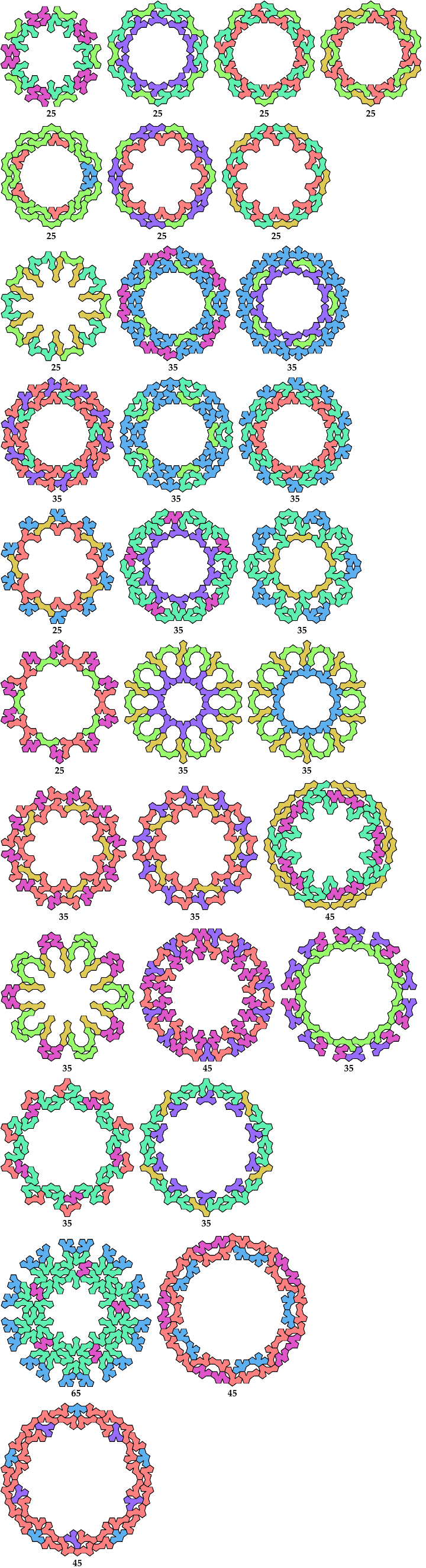 Oddities can also be constructed from sets of different shapes. Here are the minimal known oddities for triplets of tetrapents, using at least one copy of each tetrapent. Please write if you find a smaller solution or solve an unsolved case.