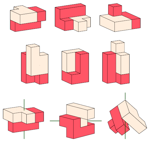 Arrange these two pieces to make 6 shapes with mirror symmetry, and 3 shapes with rotary symmetry.