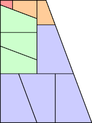 This is a contiguous partridge tiling. The tiles of each size form a connected group. This is the only contiguous partridge tiling of the monodom with 6 sizes (the minimum), except that any rectangle formed by two equal pieces may be flipped.