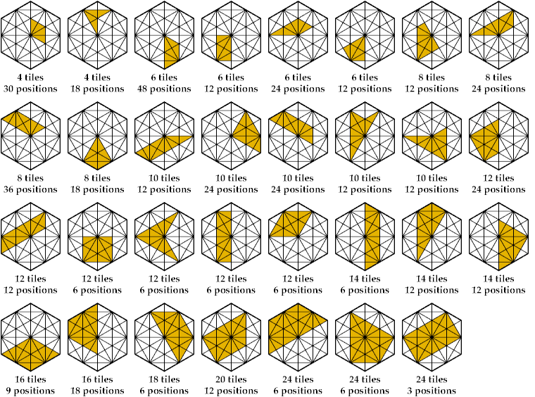 Because of the third condition, a quadrilateral can be scored only if it contains an even number of triangles. Here is a picture of the 31 sizes and shapes of scorable quadrilaterals on the board.
