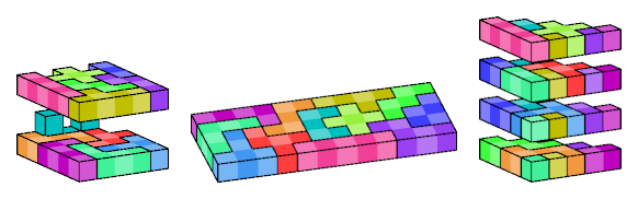 This puzzle was inspired by a suggestion from László Molnár. Some correspondents have pointed out that it resembles Stewart Coffin's Unhappy Childhood puzzle, shown here at Puzzle Will Be Played. It also resembles my two-dimensional puzzle Triple Play.