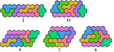 The numbers tell how many distinct tilings each 28-cell polyhex has.