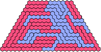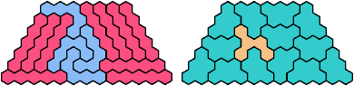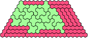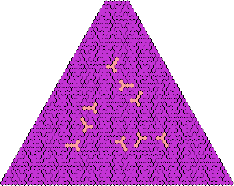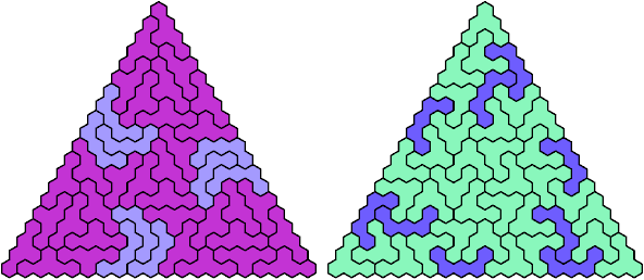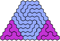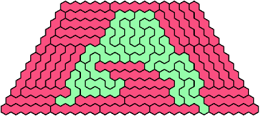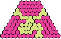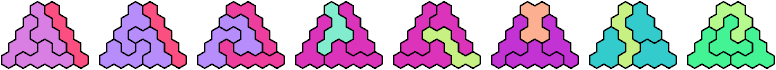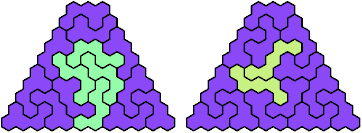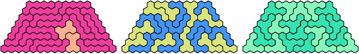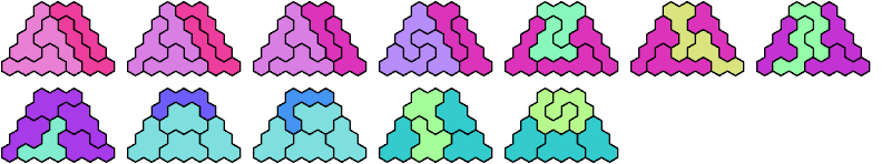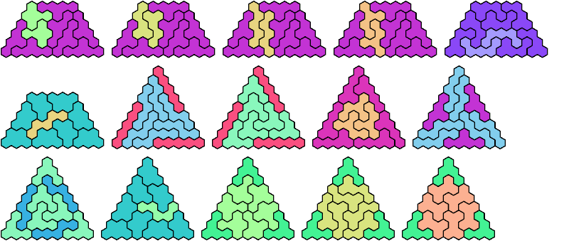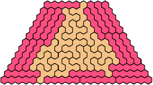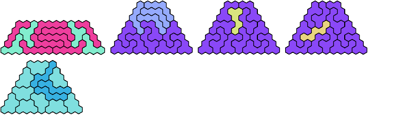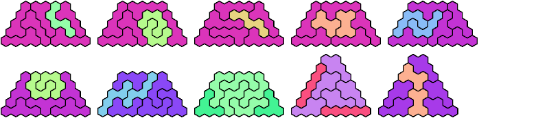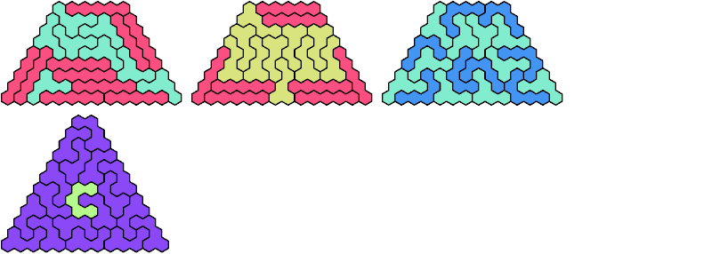 A triangular polyhex is an extreme form of a trapezial polyhex. Many of the solutions below are triangular. See the bottom of the page for non-triangular variants.
