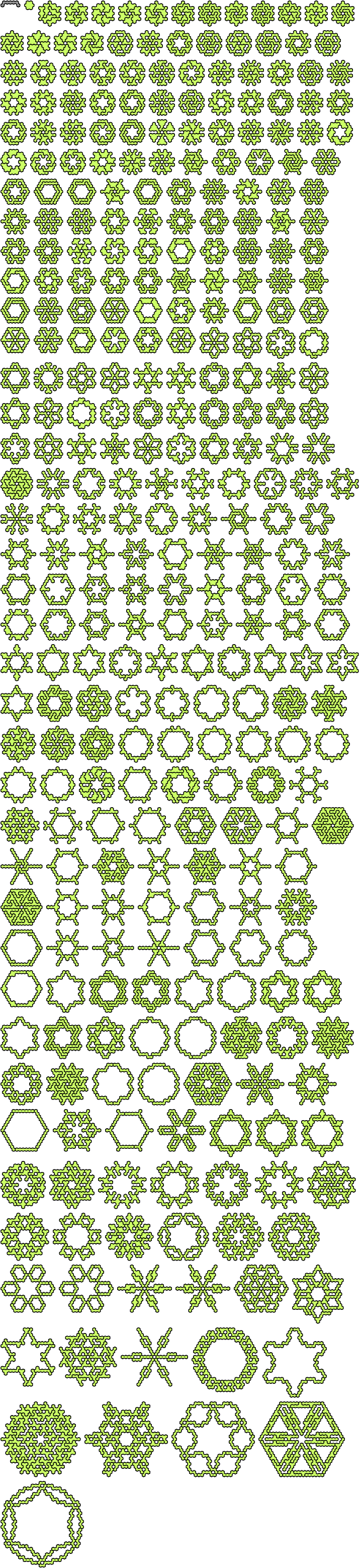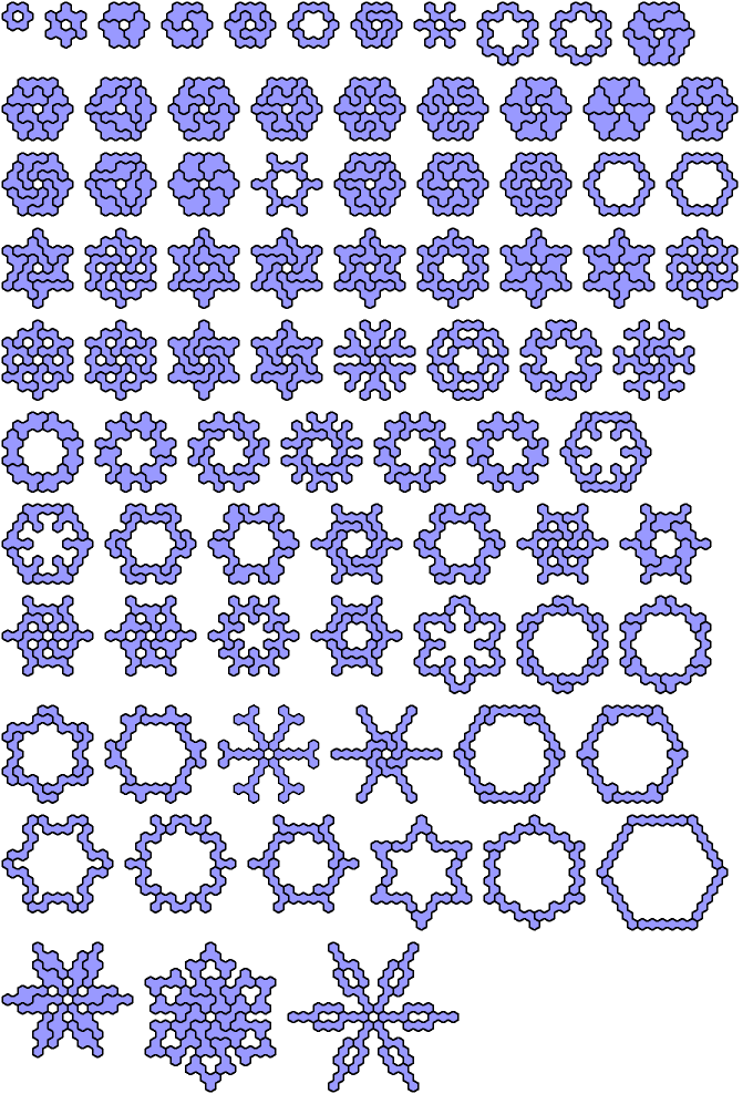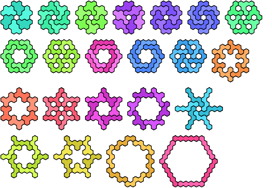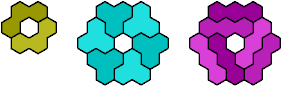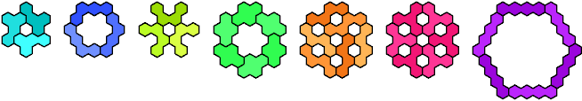 Here are minimal known Baiocchi figures for polyhexes of orders 1 through 6. Not all these solutions are uniquely minimal.